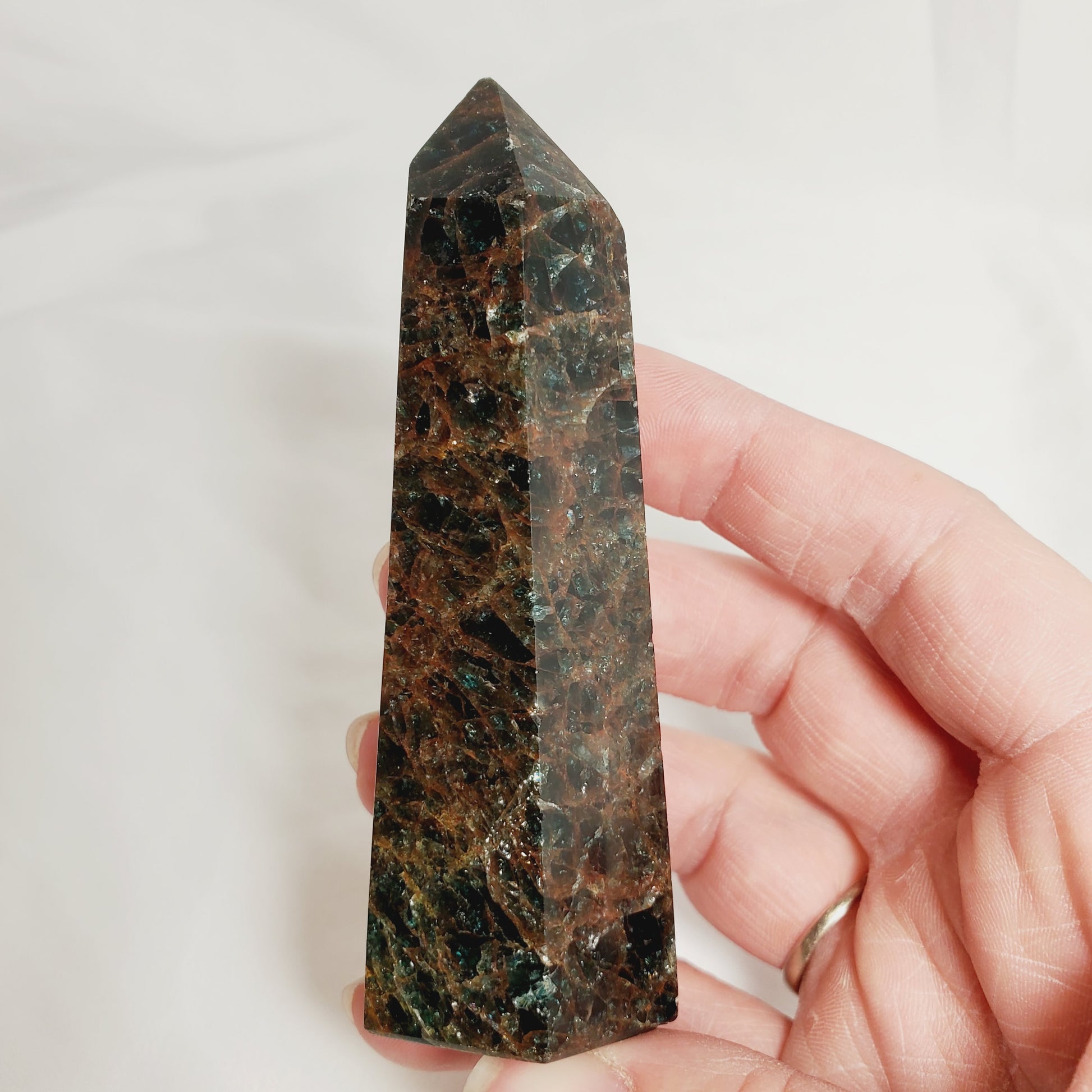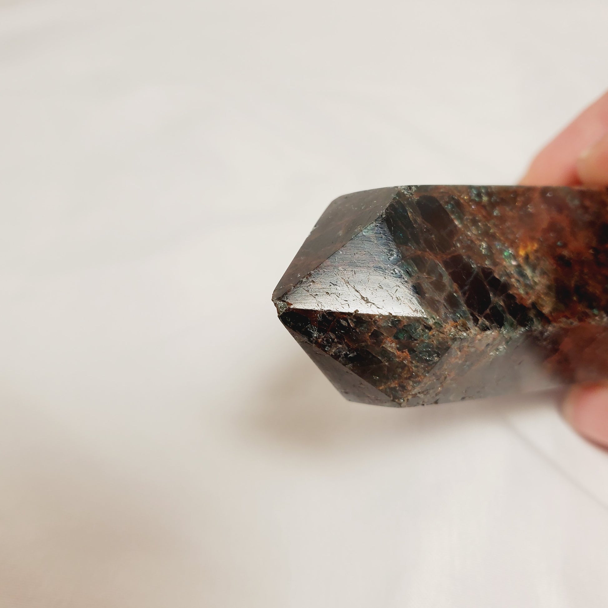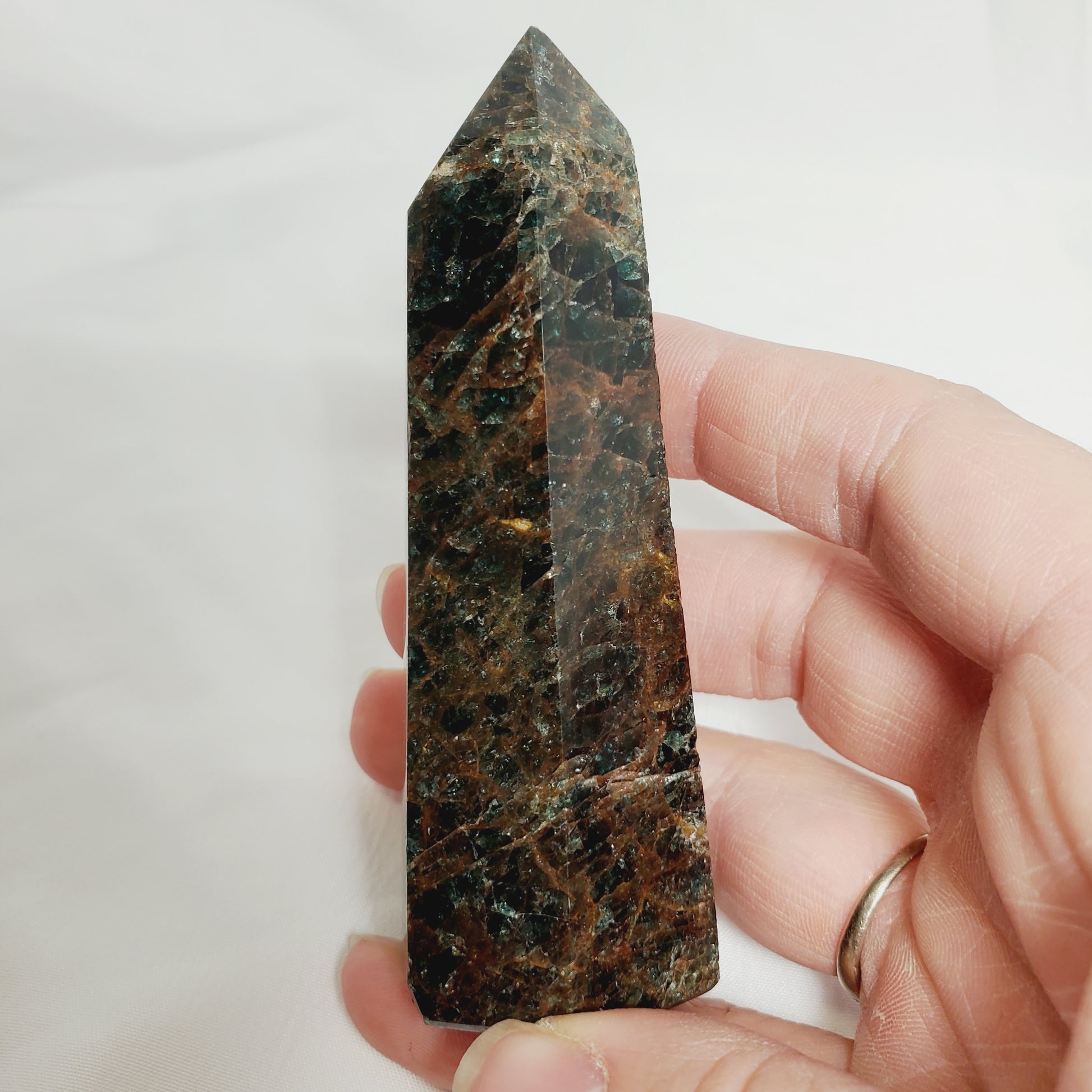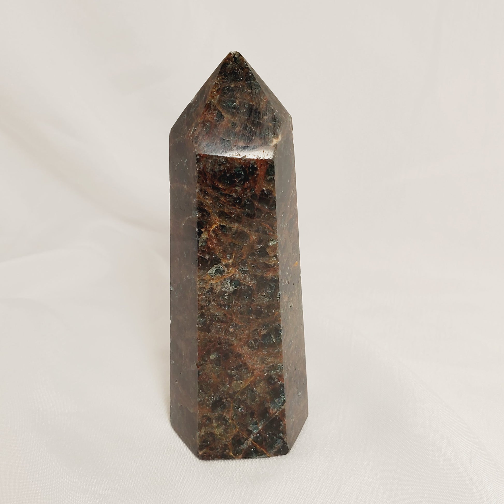 This tower is made from apatite. It has beautiful greens and reds all through it. You can even catch a shimmer if you turn it just right. The tip has a small chip but it doesn't take away from its beauty!